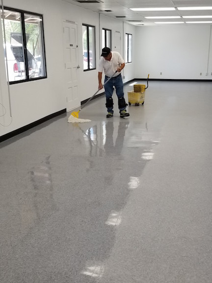 Here our team member is starting to strip a floor. We take your floor care to heart. Scrubbing the edges before scrubbing the whole floor. Stripping the old wax off the floor using a black pad. |